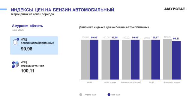 В мае индекс цен на автомобильный бензин по Амурской области составил 99,98 %, что говорит о небольшом снижении стоимости топлива.