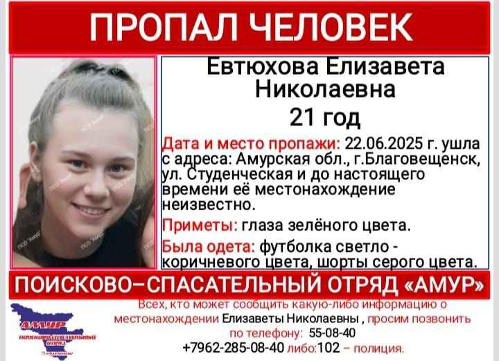 22 июня в Благовещенске пропала 21-летняя Елизавета Евтюхова. Она покинула дом на улице Студенческой, до сих пор неизвестно, где находится девушка, сообщает поисково-спасательный отряд «Амур».