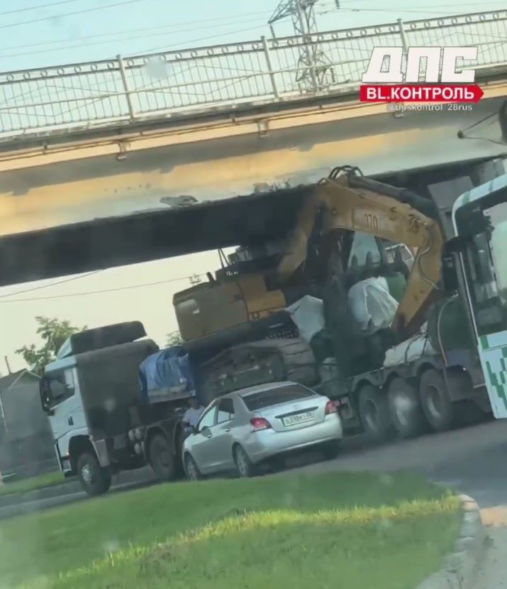 Участником и автором аварии стал водитель тягача, перевозивший на своём автомобиле экскаватор. Судя по кадрам с места происшествия, спецмашина не поместилась в проём под мостом.