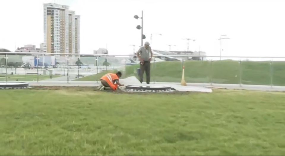 Работники ГСТК восстанавливают газон на Трибуне Холл, а именно на одном из холмов. Администрация города просит жителей областной столицы не ходить по засеянным участкам и дать газону прижиться.