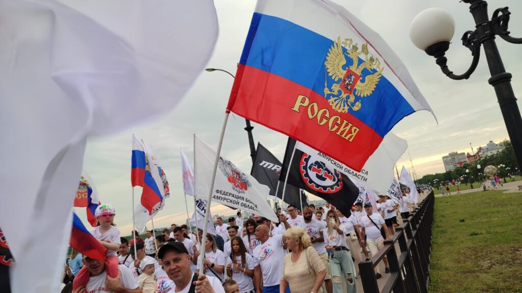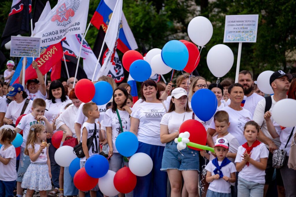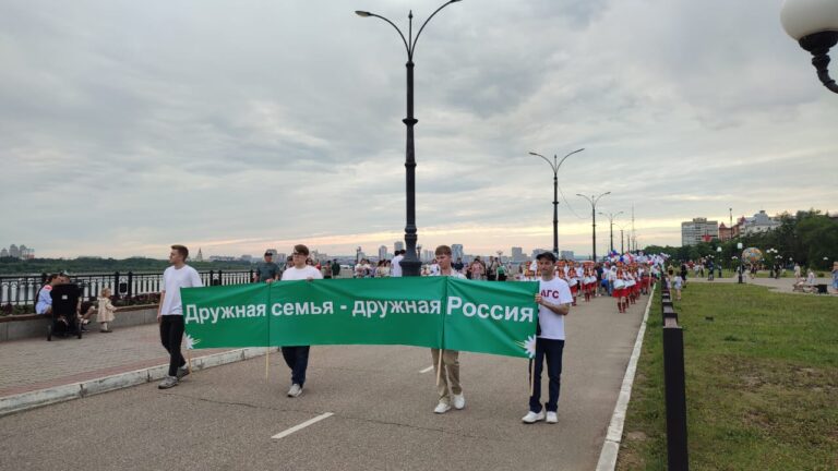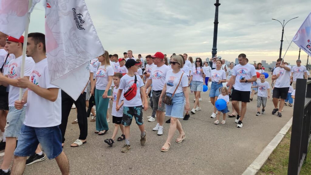 Благовещенск присоединился ко всероссийской акции «Парад семьи», приуроченной ко Дню семьи, любви и верности. Более двух тысяч амурчан прошли праздничной колонной по набережной Амура – от ротонды до флагштока. В шествии приняли участие молодые семьи, многодетные родители, семьи участников СВО, а также представители трудовых коллективов.