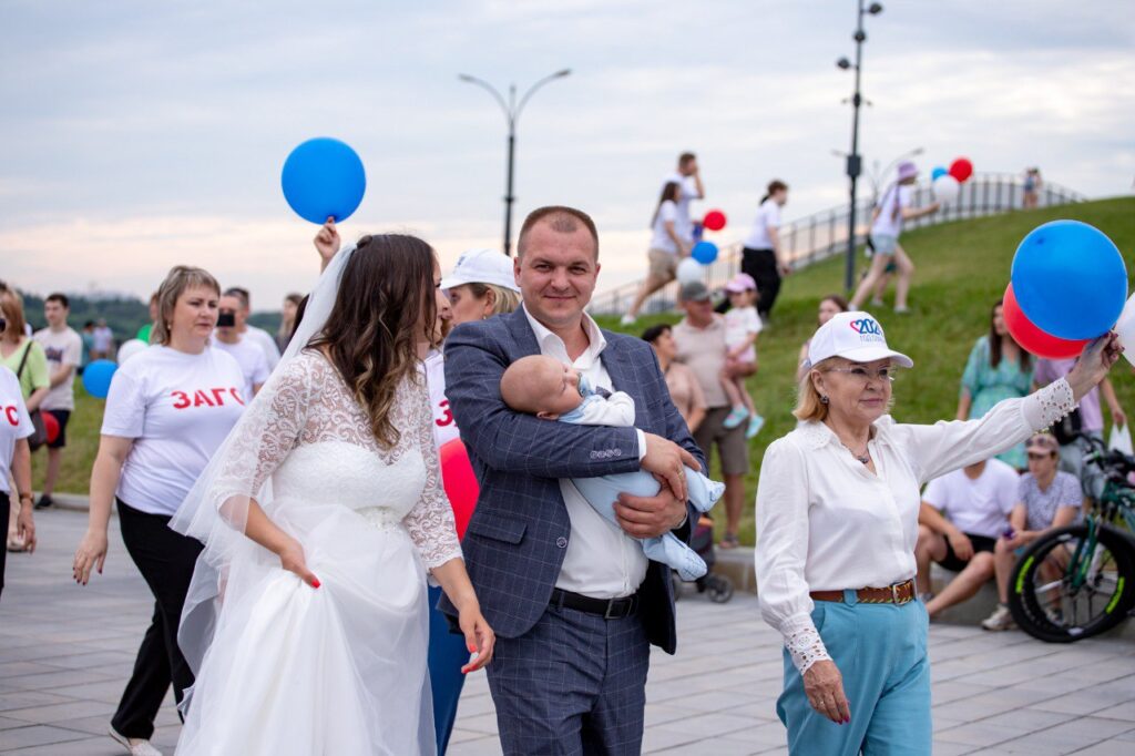 Особым моментом парада стал флешмоб в форме сердца, который исполнили молодые супруги под музыку оркестра «Амур Джаз Бэнд». Этот символ стал главным посланием события – любовь и семья лежат в основе всего.