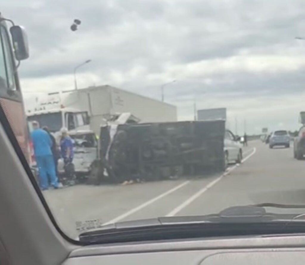 Очевидцы засняли лежащий на боку микрогрузовик и прижавшуюся к леерному ограждению фуру, между ними – смятый легковой автомобиль, а также человека прямо на проезжей части – над ним склонились прибывшие на место медики. В пресс-службе амурского управления Госавтоинспекции России корреспонденту Амур.инфо подтвердили факт ДТП, однако уточнили, что поделиться его деталями, в частности уточнить, есть ли погибшие, смогут позднее.