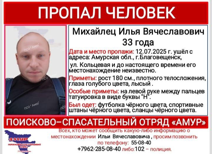 В Благовещенске ищут 33-летнего Илью Михайльца, который пропал 12 июля. Мужчина ушёл с улицы Кольцевой в областном центре и не вернулся. Ориентировку о поиске мужчины разместил ПСО «Амур».