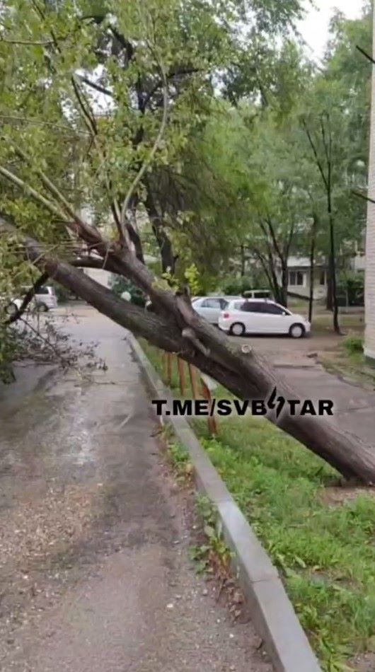 Накануне свободненцы, проживающие по адресам 50 лет Октября, 18 и 20, поделились, что в их дворе упало дерево. Своим стволом оно перегородило проезжую часть между домами.