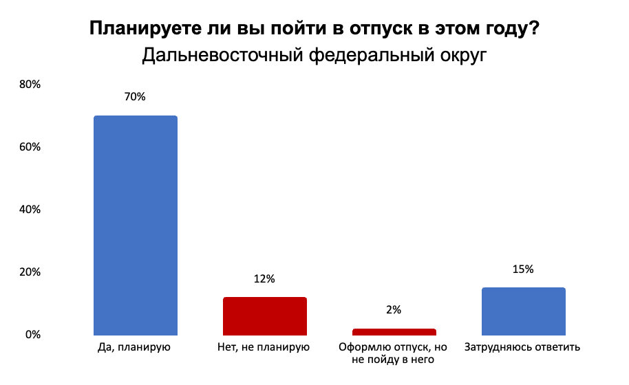А вот 16 % жителей Дальневосточного федерального округа сталкивались с ситуацией, когда работодатель заставлял их ходить в отпуск. Чаще это происходило с ИТ-специалистами (30 %), водителями и логистами (22 %), а также с работниками ресторанов, гостиниц и туристических компаний (21 %).