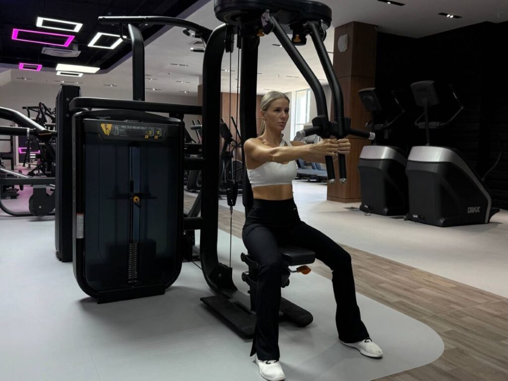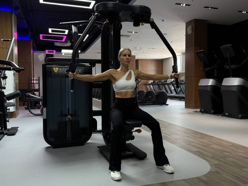 Во-вторых, это сведение рук (в том числе и с использованием тренажёра «бабочка»): здесь главное – выполнять упражнение технично, работать не только руками, а ещё и подключать грудные мышцы.