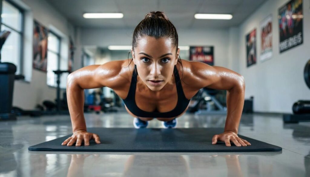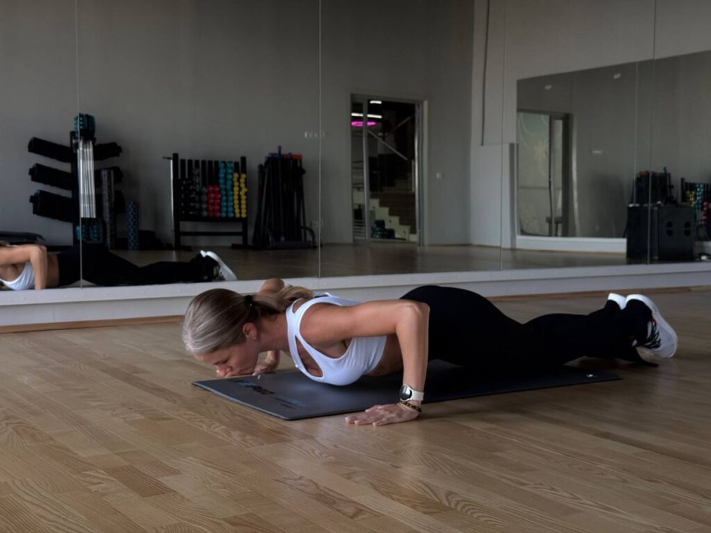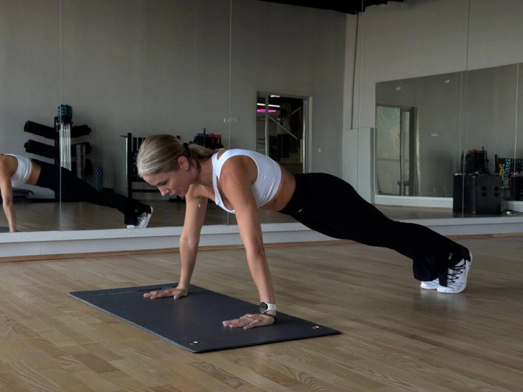 — Во-первых, это отжимания от пола с широкой постановкой рук. Знаю, что девочки не любят это упражнение, потому что оно даётся непросто, но если не торопиться, начать с упора на колени и соблюдать технику, то оно окажется одним из самых эффективных, так как задействует и развивает весь плечевой пояс.