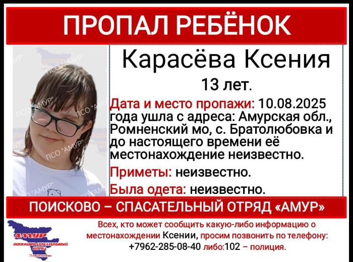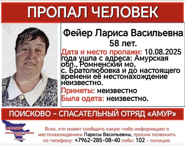 Сегодня, 10 августа, из села Братолюбовки Ромненского округа ушли Лариса Фейер и её 13-летняя родственница Ксения Карасева. О поиске сообщили в поисково-спасательном отряде «Амур».