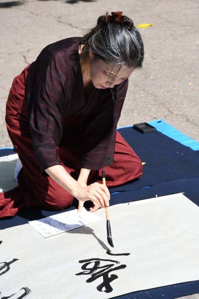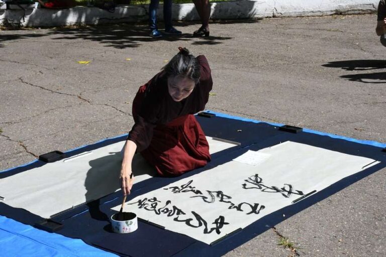 — Одним из символов нашего желания жить в мире и согласии стала уникальная акция японского мастера каллиграфии. Лучший каллиграф Японии выразила на бумаге мудрые слова Георгия Семеновича Уса, ветерана Великой Отечественной войны: «Мы ходим по одной земле, дышим одним воздухом, у нас одно небо, нам нечего делить, и мы должны жить в дружбе», – рассказала Валентина Викторовна.