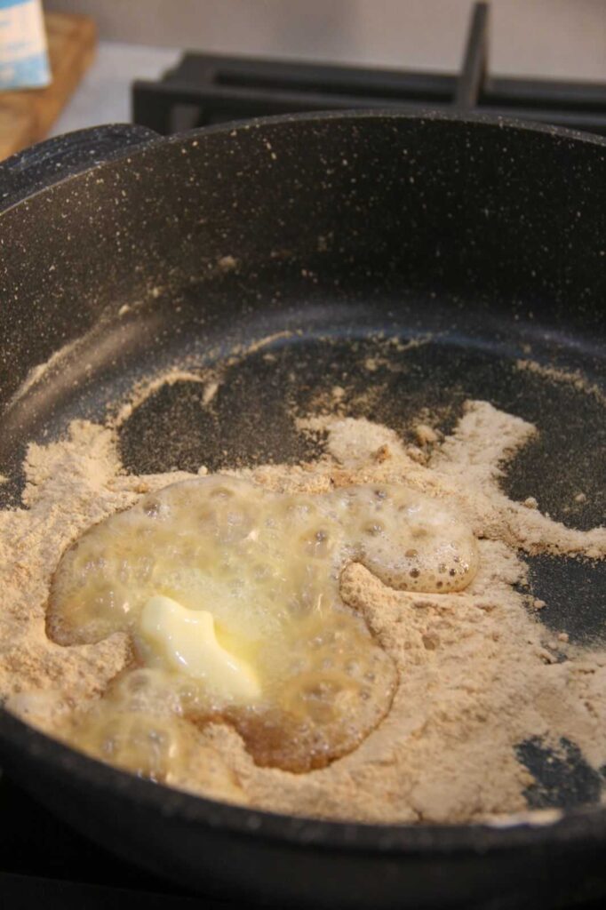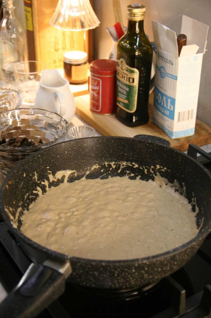 После этого нужно приготовить соус. Для этого снова ставим сковороду на средний огонь. Муку обжариваем на сухой сковороде без жира до кремового цвета, постоянно помешивая. Когда мука приобретёт светло-коричневый оттенок, добавляем сливочное масло и перемешиваем до однородного состояния. Вливаем в сковороду сливки, сразу же перемешиваем, чтобы не осталось комочков. Соус солим, добавляем мускатный орех. Продолжаем нагревать, постоянно помешивая, пока соус не загустеет.