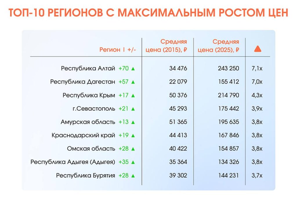 Сильнее всего жильё за это время подорожало на Алтае и в Дагестане – там цены выросли в семь раз (с 34,4 до 243,2 и с 22 до 155,4 тысячи рублей за «квадрат» соответственно). В Крыму цены увеличились в 4,3 раза, в Севастополе – в 3,9 раза. Амурская область с ростом в 3,8 раза оказалась в одной группе с Краснодарским краем, Омской областью и Адыгеей.