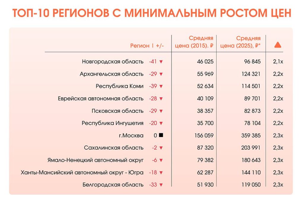А вот в Новгородской области рост оказался минимальным – всего в 2,1 раза. Чуть выше показатель в Архангельской области, Коми, Еврейской автономной области, Псковской области и Ингушетии. Даже Москва попала в список регионов с небольшим ростом – в 2,3 раза за десять лет.