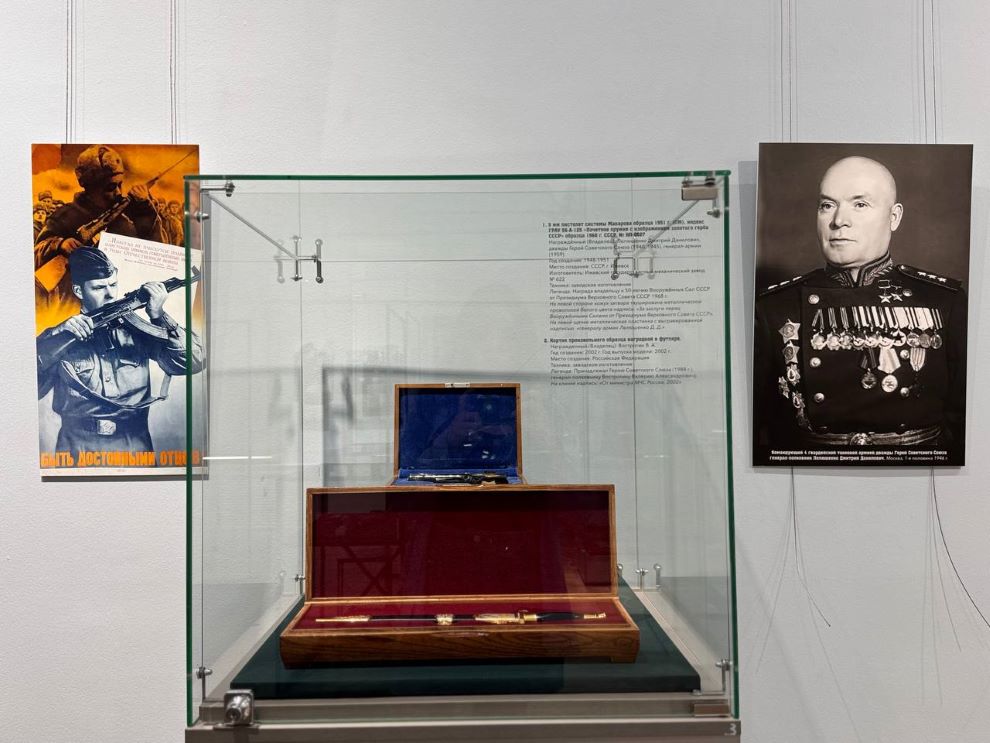 Среди экспонатов выставки оружие и личные вещи военачальников Великой Отечественной войны и даже мундир Героя Советского Союза генерал-майора Тихона Порфирьевича Абрамова, в котором он присутствовал на Параде Победы на Красной площади в Москве 24 июня 1945 года. Там есть и трофейный пистолет-пулемёт MP-40, подаренный некогда бойцами писателю Илье Эренбургу в его бытность фронтовым корреспондентом. Не обошли стороной и тему дипломатических подарков: например, многие образцы охотничьего оружия из числа экспонатов этой выставки в своё время дарили Леониду Брежневу политики из других государств.