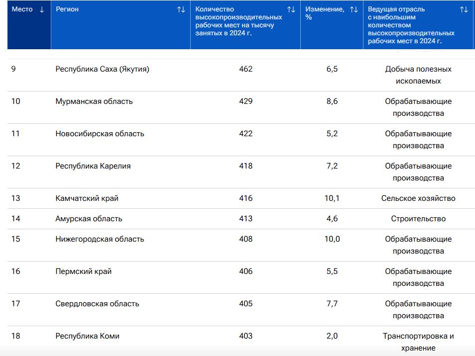 Лидером рейтинга регионов с наибольшим количеством таких рабочих мест стал Ямало-Ненецкий автономный округ – на каждую тысячу занятых здесь приходится 929 высокопроизводительных рабочих мест (ВПРМ). На втором месте Чукотский автономный округ и 819 ВПРМ на тысячу занятых, на третьем месте – Ненецкий автономный округ с показателем 811 ВПРМ. В этих регионах ведущим поставщиком высокопроизводительных рабочих мест является отрасль добычи полезных ископаемых.