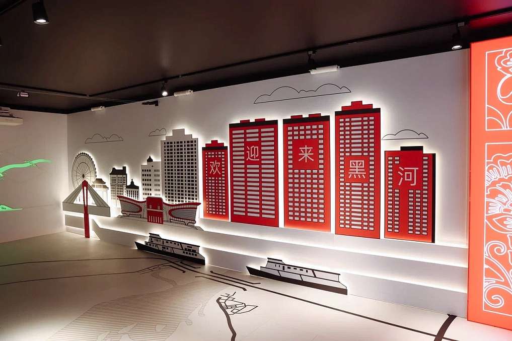 Павильон Приамурья оформлен с использованием красного цвета – отсылка к цветам флагов России и Китая. Главный акцент первого этажа как раз и отражает российско-китайское сотрудничество через проекты и события последних десяти лет, включая проект «Золотая миля», международный автомобильный мост и трансграничную канатную дорогу.