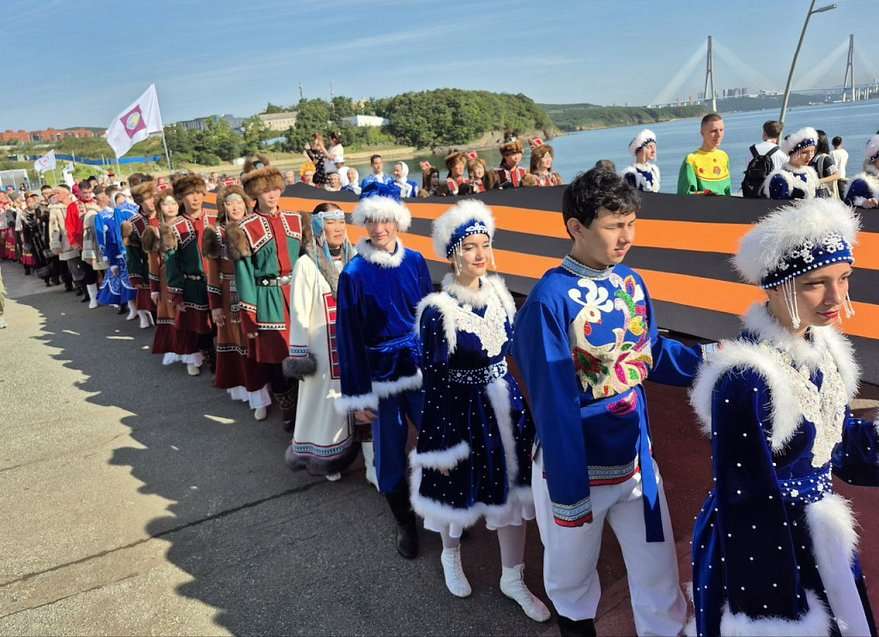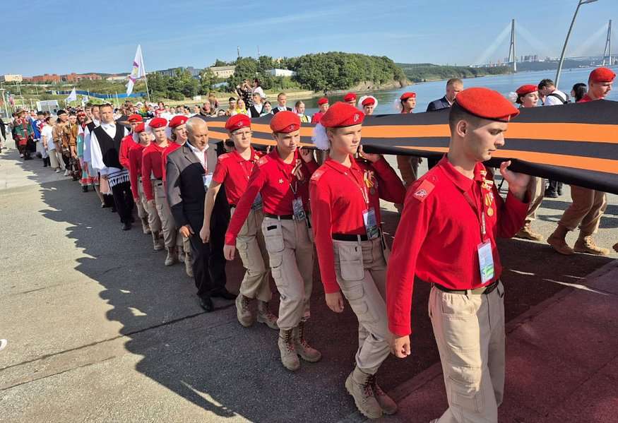 Мероприятие украсили посвящённые окончанию Второй мировой войны праздничное шествие с большой георгиевской лентой и церемония внесения флага России и Знамени Победы.