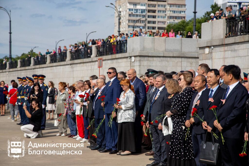Кульминацией церемонии стало прохождение войск Благовещенского гарнизона, а завершились памятные мероприятия на набережной Амура традиционной акцией «Цветы на воде». Олег Имамеев в своем телеграм-канале сообщил, что к ней присоединились коллеги из Якутска и города-побратима Хэйхэ. Вместе они запустили в Амур цветочные венки как символ памяти, скорби и уважения к павшим героям.