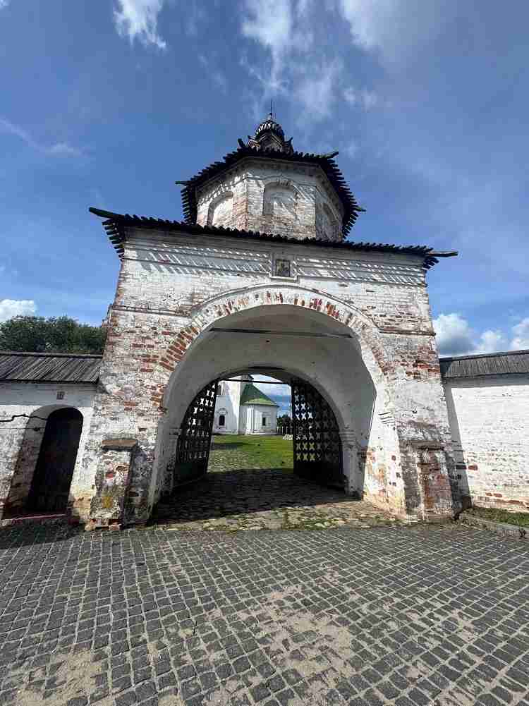 Еще на въезде в город бросилась в глаза, как мне тогда показалось, деревянная церковь – позже выяснилось, что это вход в город из срубов без единого гвоздя – суздальский Музей деревянного зодчества.