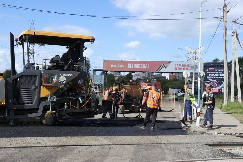 Параллельно специалисты выполнили ремонт железнодорожного переезда. Для комфорта водителей уложили новый резинокордовый настил. Это специальное покрытие, которое предотвращает скольжение и отличается эластичностью по сравнению с бетонными плитами.