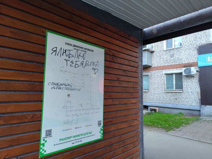 Любовь – прекрасное и возвышенное чувство, но не в тот момент, когда пылкие слова переносят на объекты городской инфраструктуры. Так, неизвестный пока благовещенец решил выразить свою нежную привязанность не прекрасным поступком во имя дамы сердца, а просто изрисовав остановку.