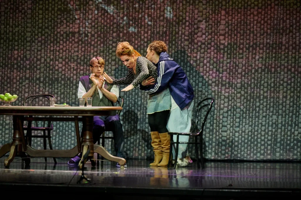 Зато абсолютно в характере перед зрителем предстает Инна – 35-летняя сестра Ольги, «весьма потасканная дама», как отметил в пьесе Коляда. Харизма Агриппины Стекловой, которая исполнила эту роль, просто зашкаливала – во многом благодаря ей первое действие прошло под дружный хохот зала.