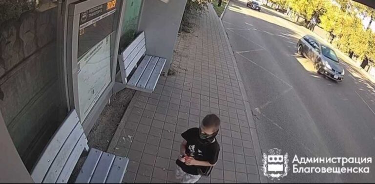 Мальчик с платком на лице разбил стекло остановки в Благовещенске