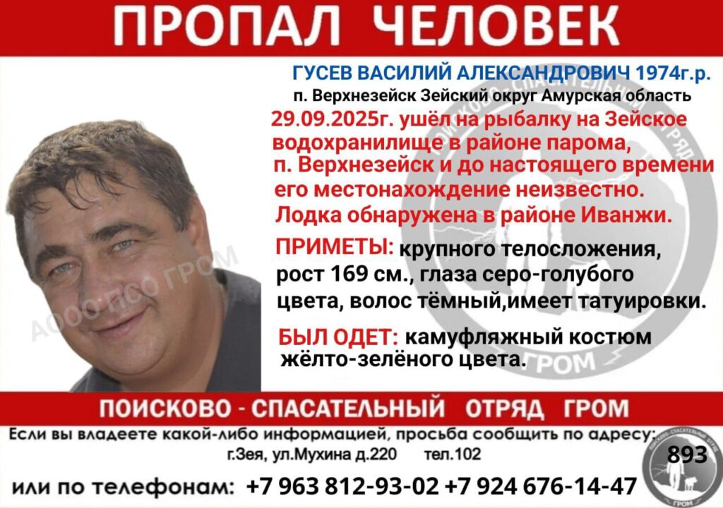 В поселке Верхнезейск Зейского округа пропал 51-летний Василий Александрович Гусев. В поисково-спасательном отряде «Гром», сообщили, что мужчина не вернулся с рыбалки.