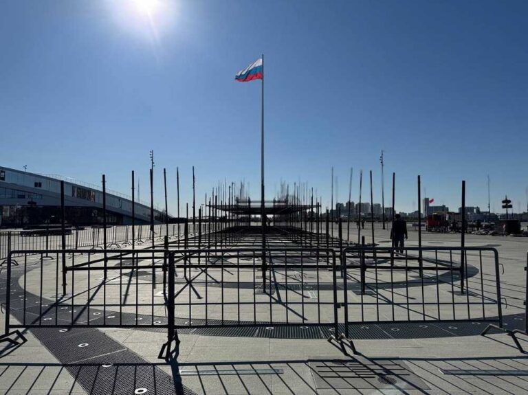Параллельно со сбором горки идет консервация фонтана, чтобы защитить его в зимний период. Также опоры горки устанавливают на специальные конструкции, чтобы не повредить тротуарную плитку.