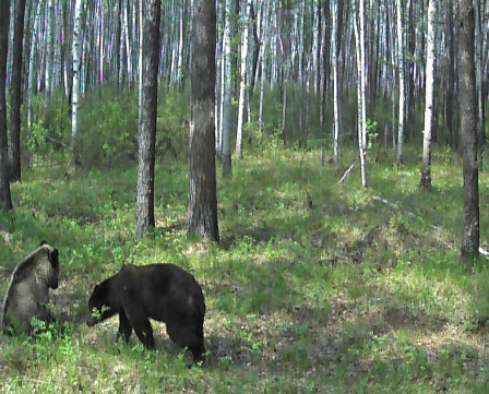 На фото рядом с бурым медведем будто бы его ожившая тень. Но на самом деле рядом с «классическим» мишкой Принцесса Мэри, обладательница редкого для наших мест светло-палевого окраса. Она попала в объектив фотоловушки недалеко от кордона Осиновый.