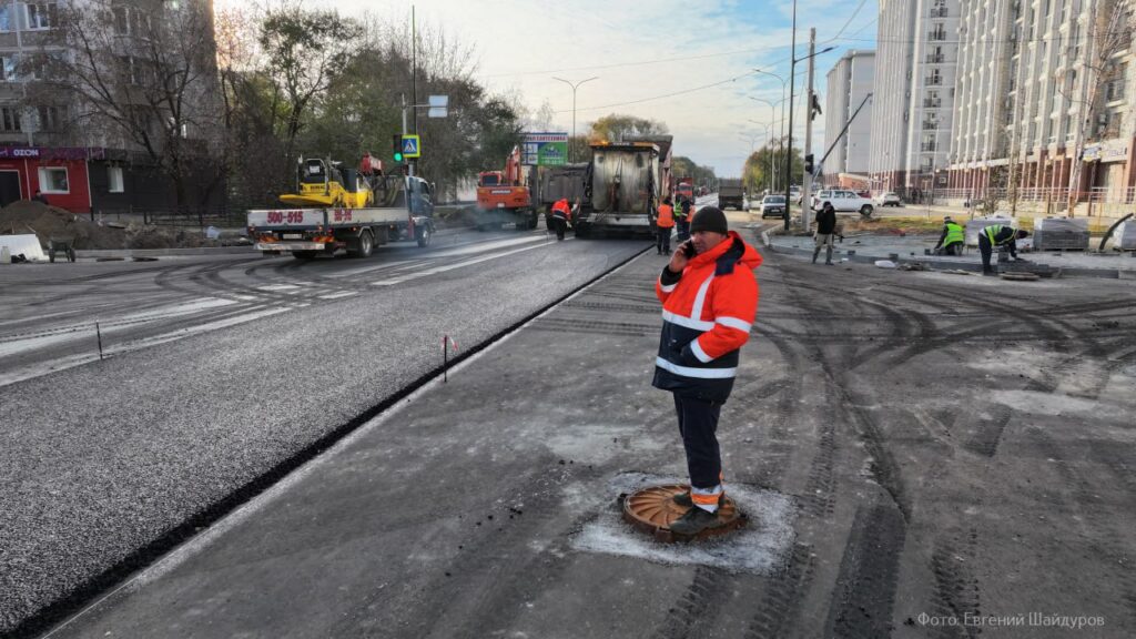 Начальник участка Максим Тупикин рассказал, что работы ведутся одновременно на нескольких направлениях. Две комплексные бригады занимаются укладкой асфальта, а также подготовкой основания парковочных площадок для дальнейшего покрытия.