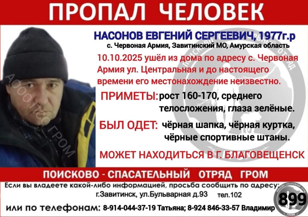 Насонов Евгений Сергеевич пропал 10 октября. Он ушел из своего дома на улице Центральной села Червоная Армия. Сейчас близкие 48-летнего амурчанина не знают о его местонахождении. Предполагается, что он может быть в Благовещенске.