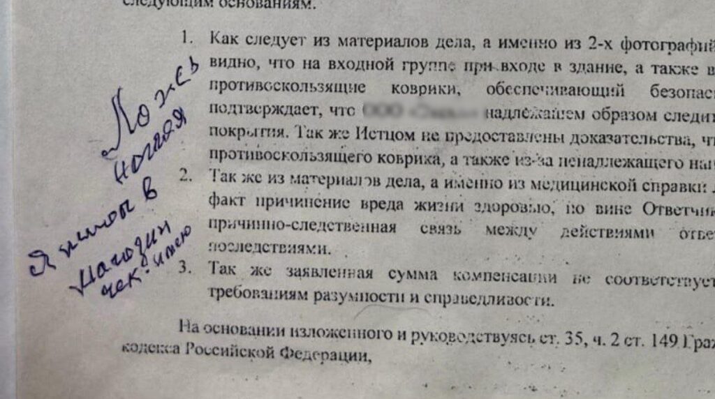 Пройдя через череду проблем со здоровьем, Владимир Сергеевич подал письменную претензию в адрес предпринимателя только 23 апреля. Ответ не заставил себя ждать, его предоставили в недельный срок. В магазине ответили, что место, где произошёл инцидент, не входит в договор аренды. А значит, и спрашивать с магазина нечего.