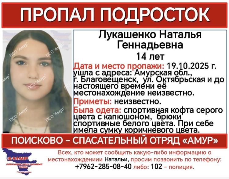 В Благовещенске всю ночь продолжались поиски 14-летней Натальи Лукашенко. Ориентировку на пропавшего подростка разместили в телеграм-канале ПСО «Амур».
