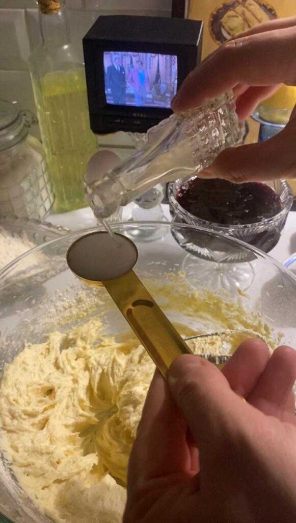 Далее нужно погасить соду лимонным соком и влить в тесто. Высыпаем остальную муку и замешиваем тесто. Ориентируйтесь не на объем муки, а на густоту теста, потому что муки каждый раз может уходить больше или меньше обозначенных в составе граммов. Тесто в итоге должно быть не липучим и не текучим, а вязким, податливым. И главное – оно должно хорошо раскатываться и держать форму.