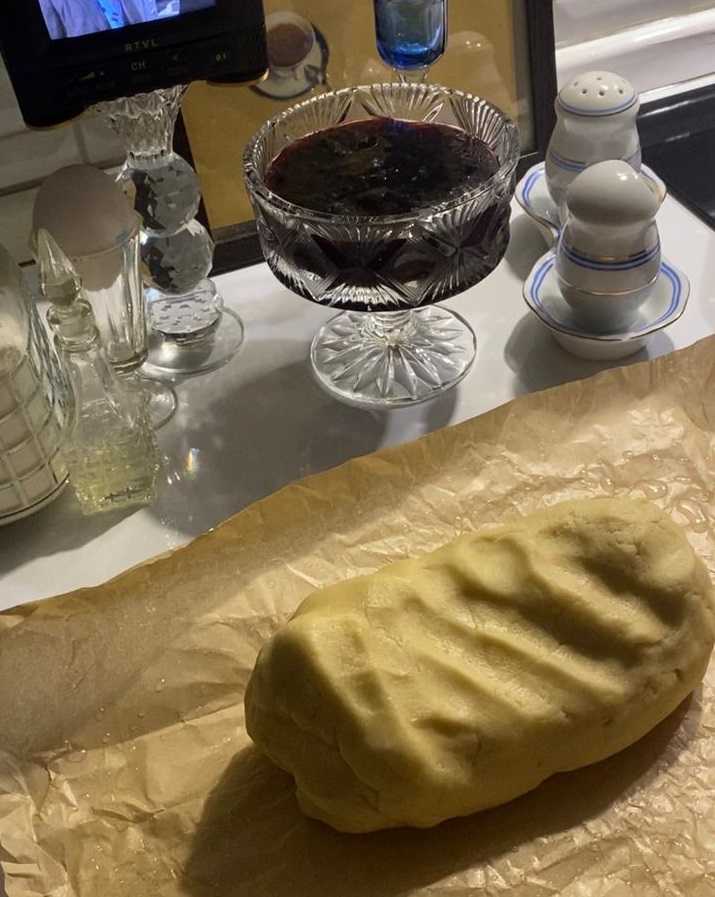 Отделите 1/3 теста, заверните в пакет и отправьте его в морозилку на 15-30 минут, в зависимости от температуры морозилки. Нужно, чтобы оно стало твердым. Так его проще будет натереть на терке.