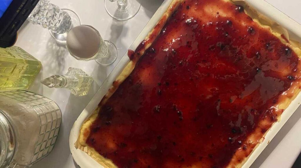 Остальное тесто раскатываем на столе в пласт толщиной 1 сантиметр. Чтобы тесто не липло к поверхности, можно взять специальный коврик или сразу предварительно смазанный маслом лист пергамента. Далее перекладываем раскатанное тесто на противень. Размазываем по тесту варенье. Если вдруг варенье жидковато, можно предварительно смешать его с манкой, мукой или проварить с крахмалом.