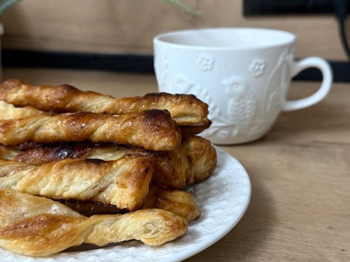 Слоеное тесто раскатываем, посыпаем его сахаром и корицей, заранее смешанными, еще раз раскатываем и режем на полосочки. Выкладываем их на противень, застеленный пергаментом. Выпекаем до золотистого цвета. Хрустящее и очень вкусное печенье готово.