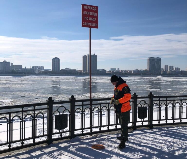 В областном центре вдоль набережной Амура спасатели разместили предупреждающие знаки «Переход (Переезд) по льду запрещён». Об этом сообщили в городском управлении по делам ГОЧС.