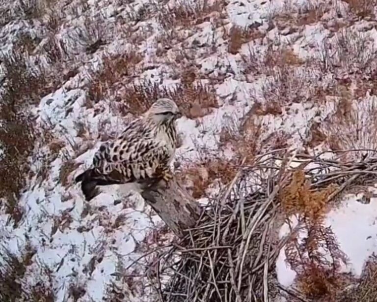 Гнездо посреди болота птицы используют как место для отдыха и обзора территории. На видео с онлайн-камеры удалось заметить седого дятла, голубых сорок и даже канюка, мохноногого зимняка.