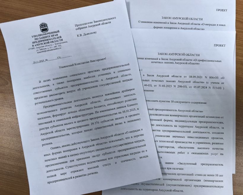 Пакет документов со всеми необходимыми данными уже направлен председателю амурского Заксобрания Константину. Амурский бизнес-омбудсмен отметил, что практика присвоения особых званий предпринимателям применяется в разных регионах России, в том числе у соседей-дальневосточников – в Бурятии и Забайкалье.