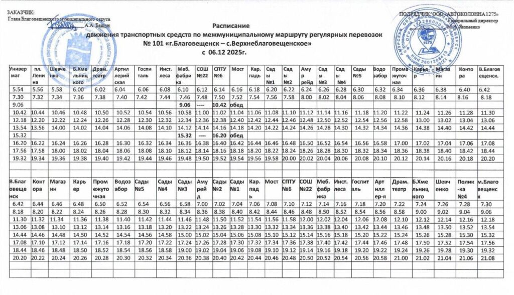 С 6 декабря в Благовещенском округе меняется расписание движения автобуса № 101, который ходит между Благовещенском и селом Верхнеблаговещенское. Вместе с этим маршрут ждут ещё несколько изменений.