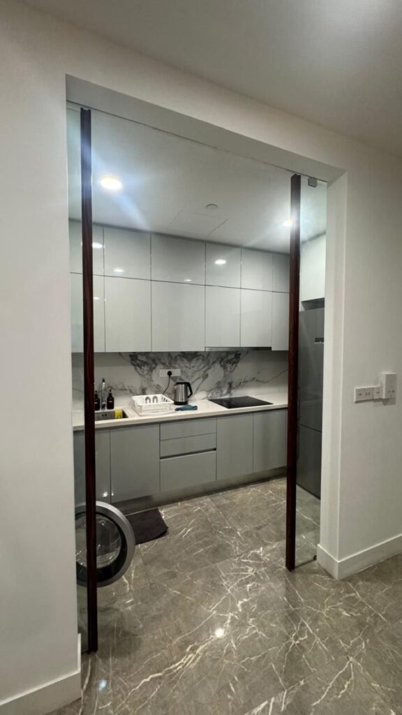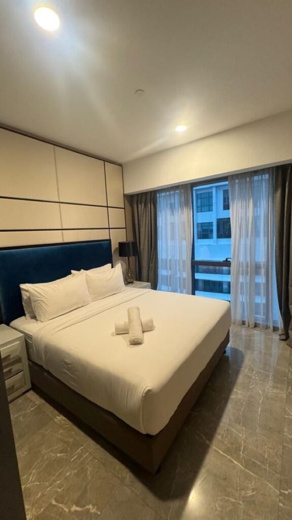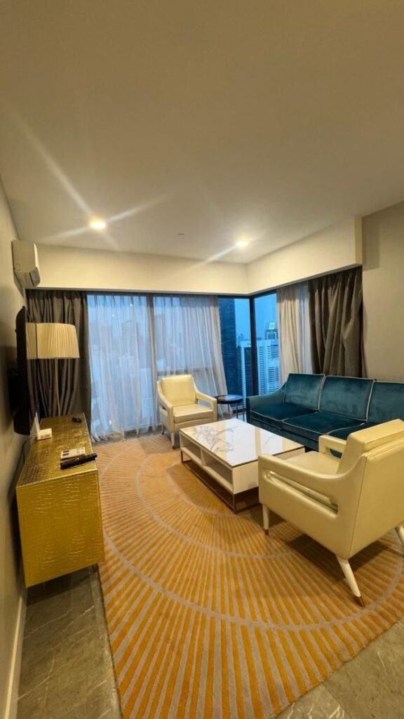 В санузле две раковины, душ, унитаз. В апартаментах при этом есть абсолютно всё для комфортной жизни: фен, утюг, вся посуда – разделочные доски, сковородки, ножи, бокалы, чашки, тарелки, пиалы. Есть микроволновка, стиральная машина, холодильник, в гостиной два кондиционера. Потолки, наверное, больше трёх метров. И в гостиной, и в спальне установлено по телевизору, но почему-то нет сейфа. Прежде чем провести уборку, персонал пишет тебе в мессенджере: «Вам нужна уборка?». Если ответите, что не нужна, никто не станет её навязывать. Сотрудники приветливые все, очень высокий уровень сервиса.