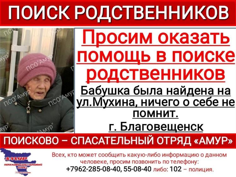Как рассказали в ПСО, дезориентированную бабушку нашли на улице Мухина. Пенсионерка не смогла назвать своего имени и адреса. Поэтому поисковики обратились за помощью к жителям Благовещенска: если вам что-то известно об этой бабушке или о её родственниках, позвоните по телефонам, указанным в ориентировке.