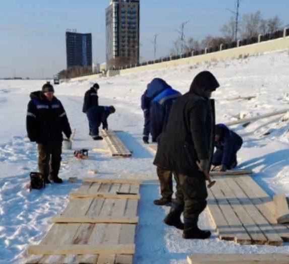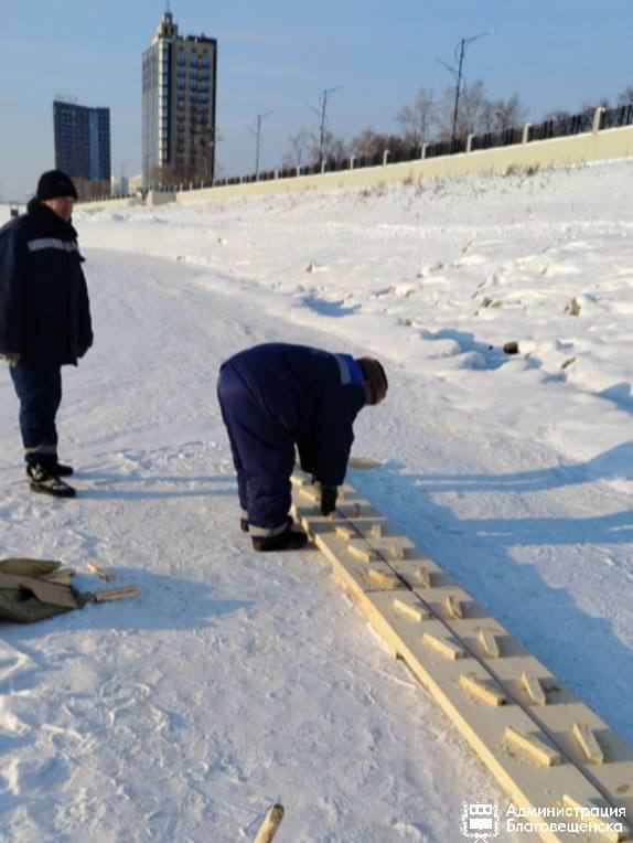 Сотрудники ГСТК установили восьмиметровую лестницу для спуска от набережной к Амуру, проложили пятидесятиметровую дорожку от берега к месту купания и сделали настил вокруг купели.