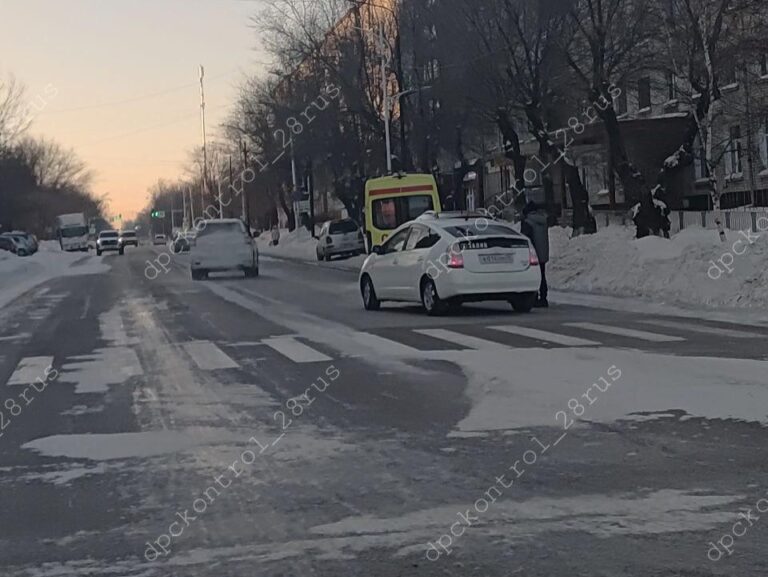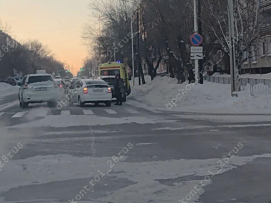 На фотографиях, опубликованных в телеграм-канале «ДПС контроль Благовещенск», видно машину реанимации, работавшую на месте ДТП. По информации ГАИ, пострадавшую девушку увезли в больницу.