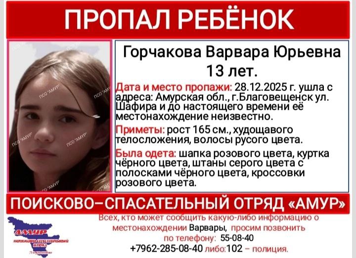 В Благовещенке пропала 13-летняя Варвара Юрьевна Горчакова. Об этом сообщили в поисково-спасательном отряде «Амур».