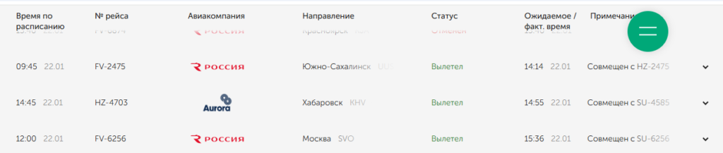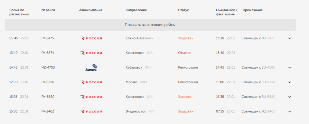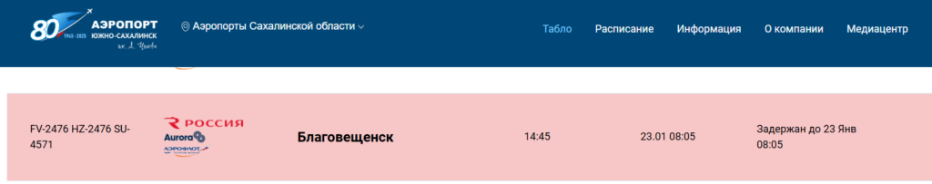 Действительно, по данным онлайн-табло аэропорта Южно-Сахалинска видно, что рейс в Благовещенск перенесен на 23 января.