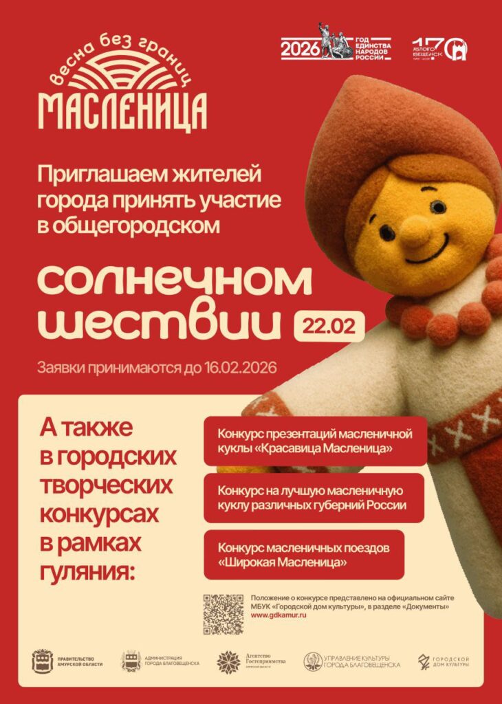 Как сообщили в администрации Благовещенска, 22 февраля в городе состоится «Солнечное шествие». Участников и гостей ждёт яркое карнавальное действо с куклами, костюмами и творческими номерами.
