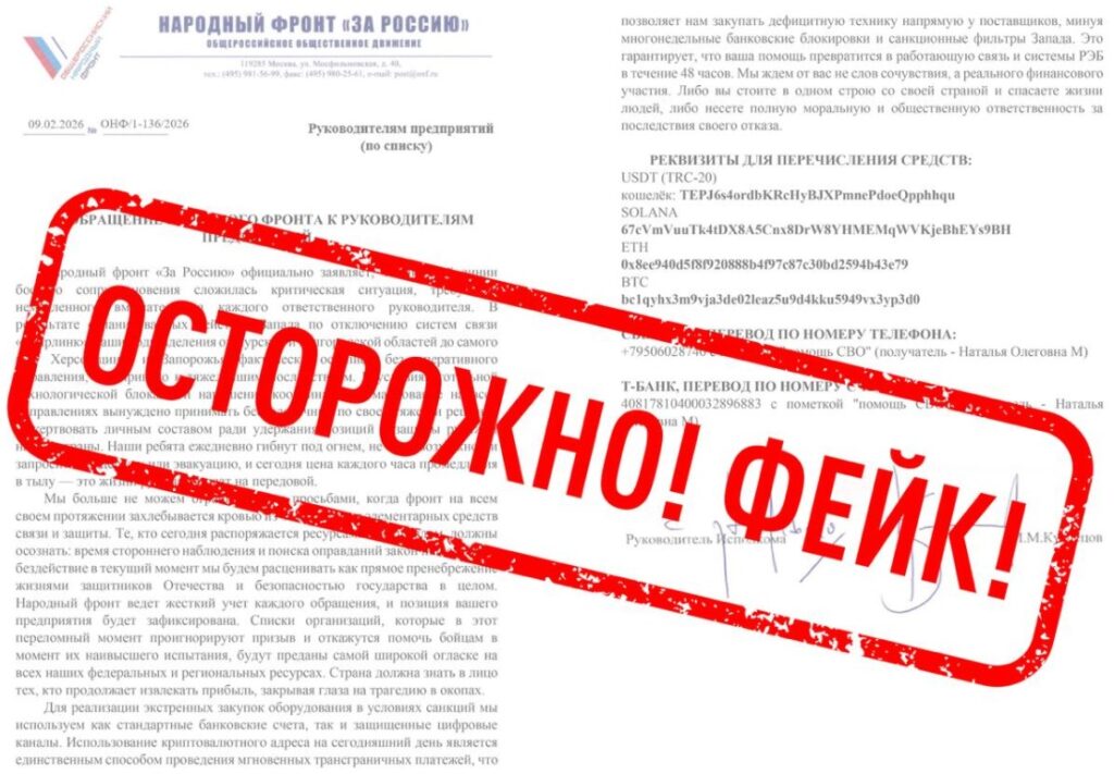 «Вновь участились случаи распространения фейков от имени Народного фронта. В этот раз мошенники сделали эмоциональную рассылку по организациям, корпорациям, бизнесу с призывом пожертвовать средства „на помощь СВО“», – сообщают в НФ.